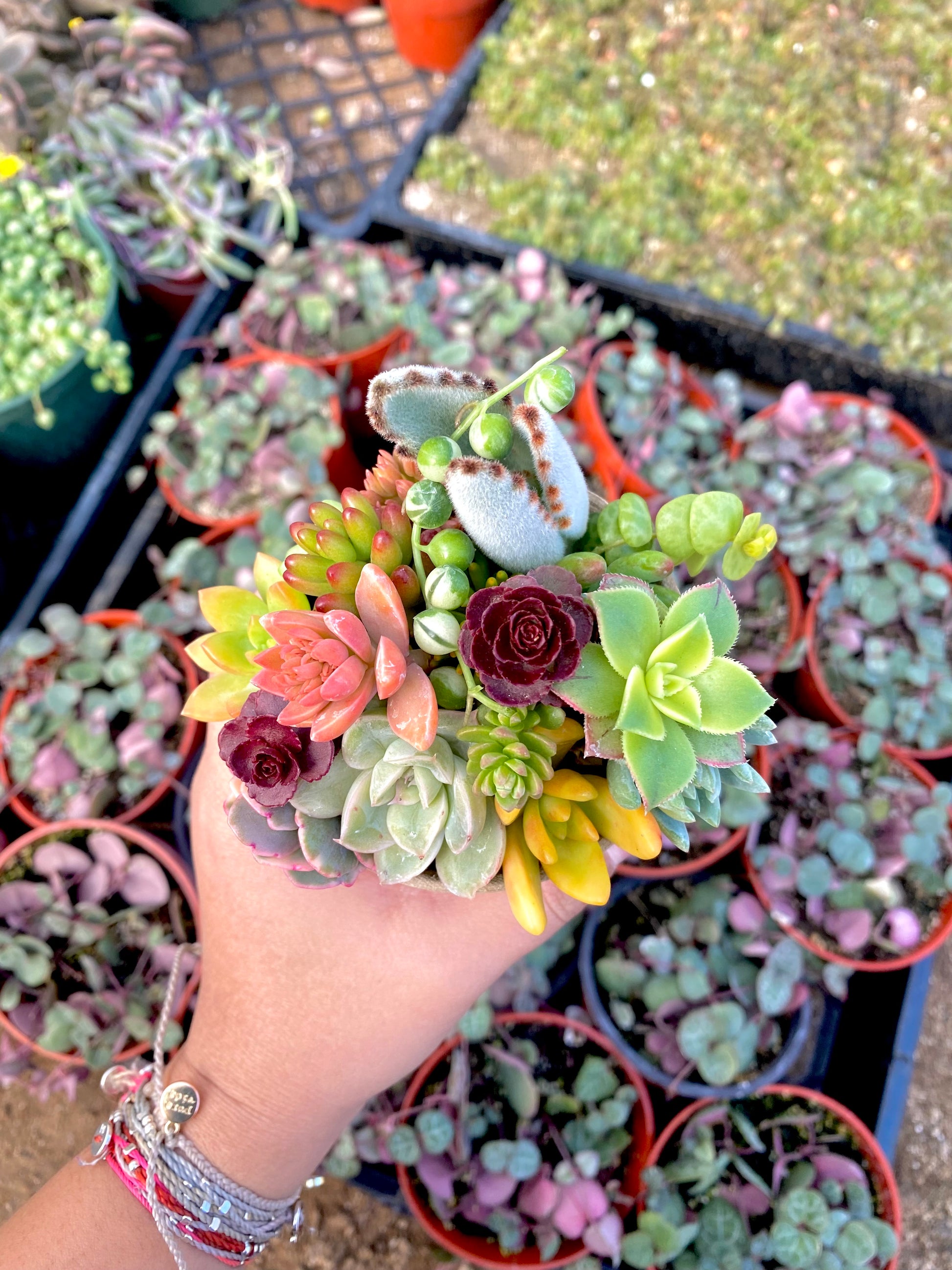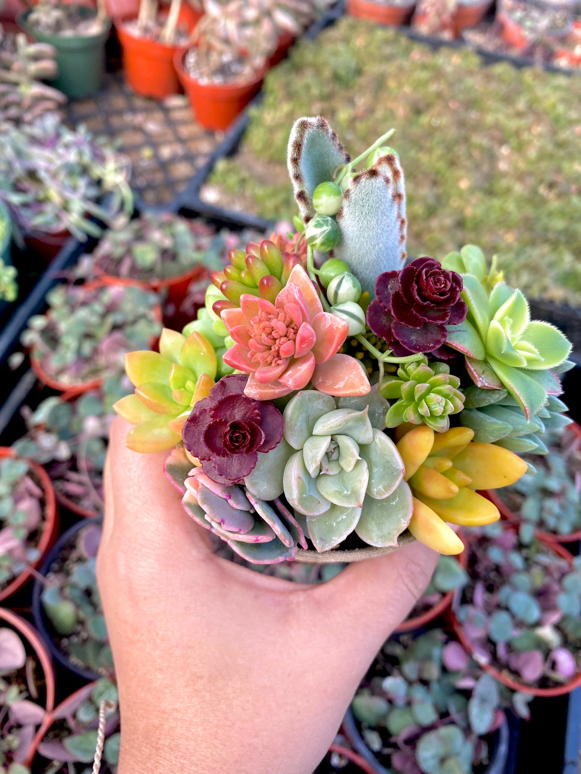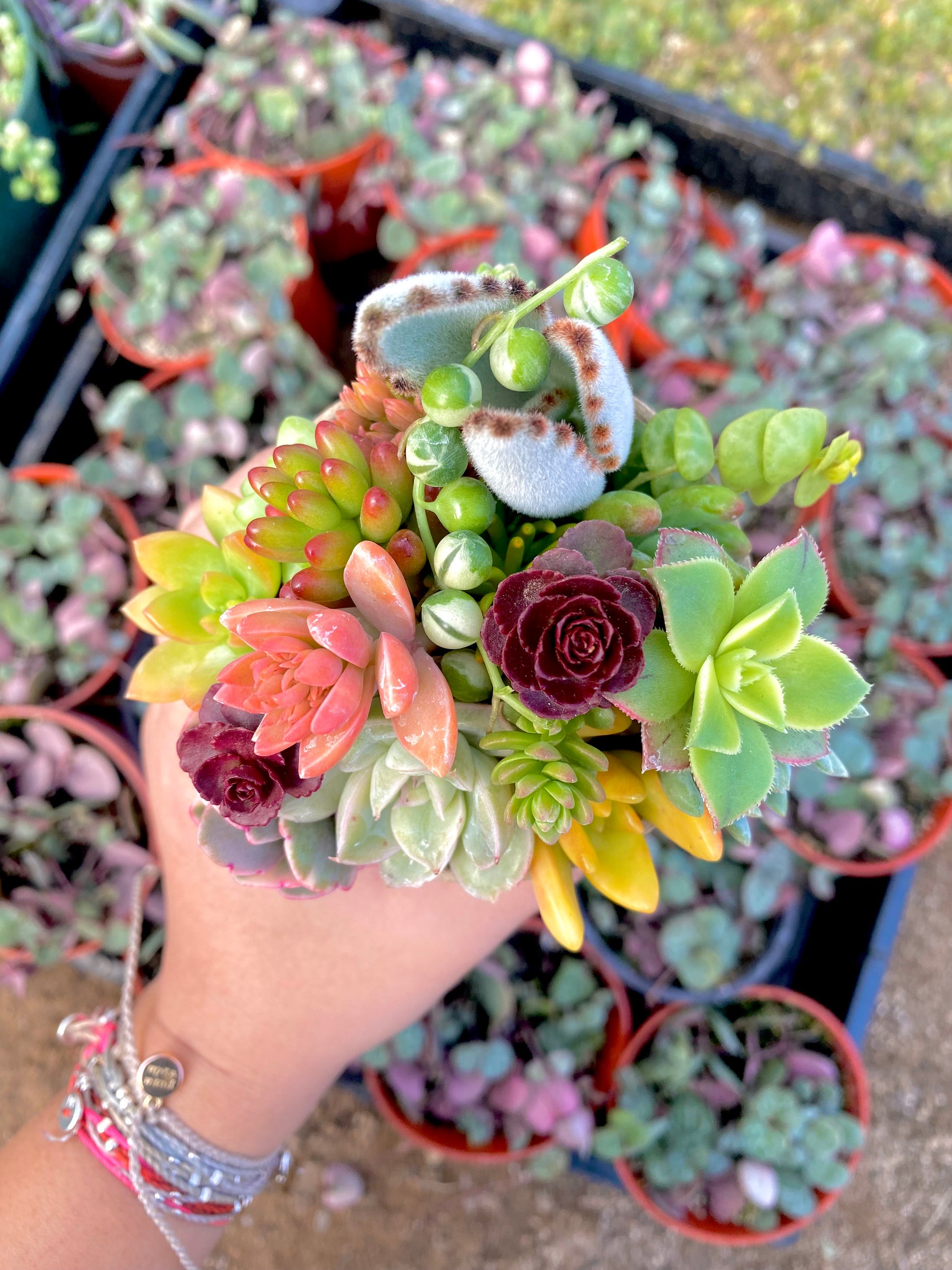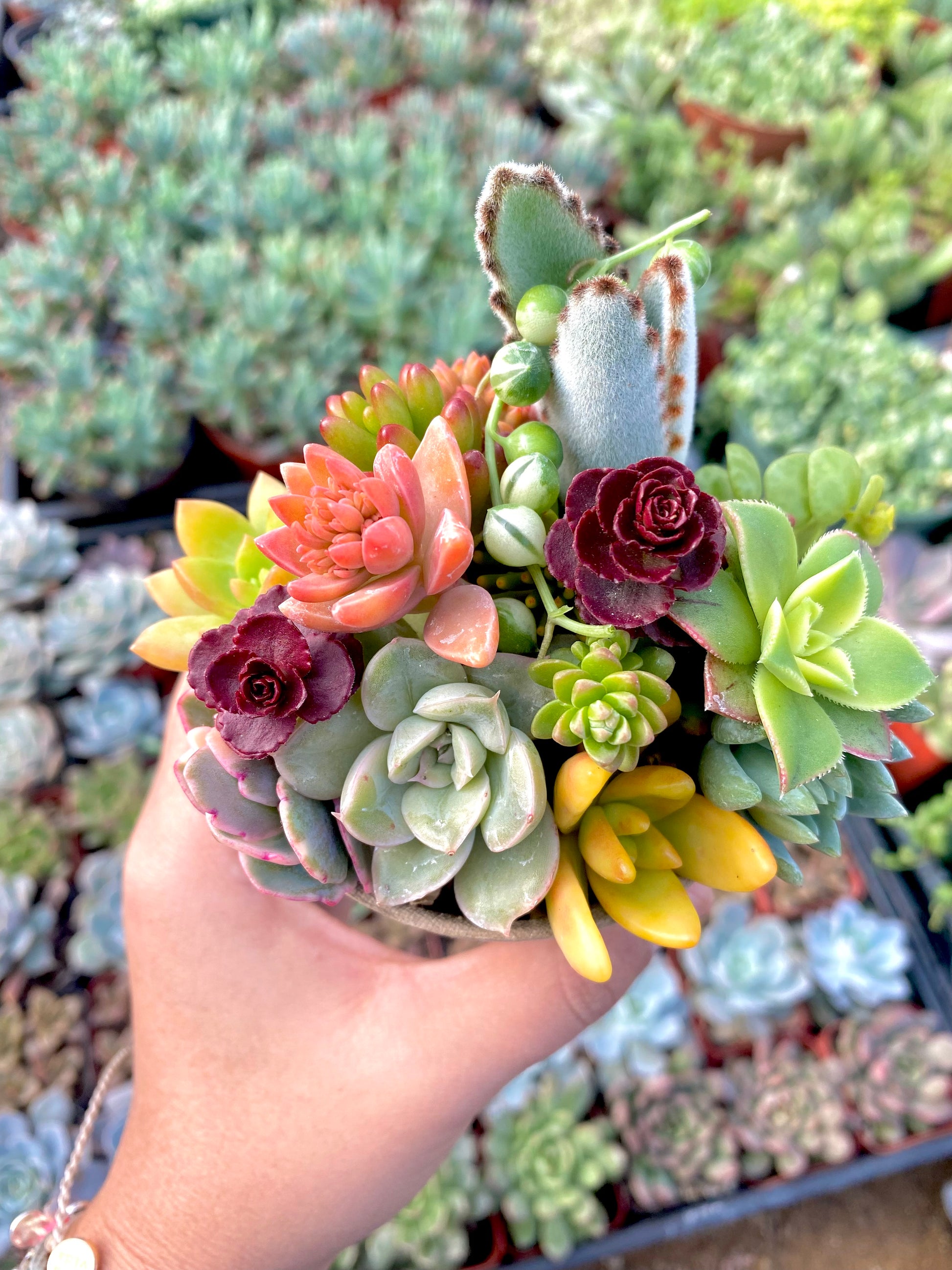 Create a stunning succulent arrangement with a diverse mix of shapes, colors and textures.