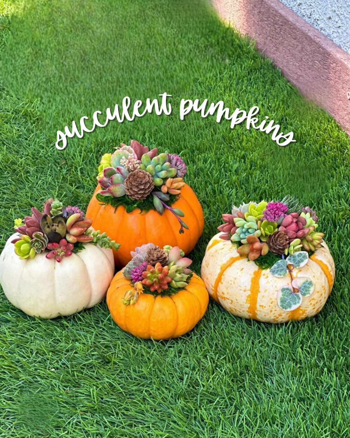 Each pumpkin is topped with a beautiful variety of succulent cuttings, carefully attached with hot glue onto a moss base. The cuttings will vary based on season and availability, making each piece one of a kind.